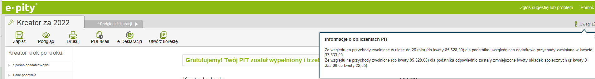 W programie e-pity zastosowaliśmy szacunkową symulację tego podatku hipotetycznego na podstawie wprowadzonych danych w kreatorze - stąd komunikat, który się pojawił. Państwa rozliczony PIT jest wypełniony poprawnie zgodnie z aktualnie obowiązującymi przepisami Nowego ładu 2.0, jakie zostały wprowadzone w lipcu 2022 r.