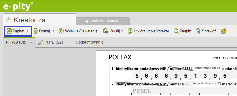 Zaawansowany zapis pliku PDF na dysk uruchamiamy z poziomu otwartego formularza - klikamy w przycisk 'Zapisz'