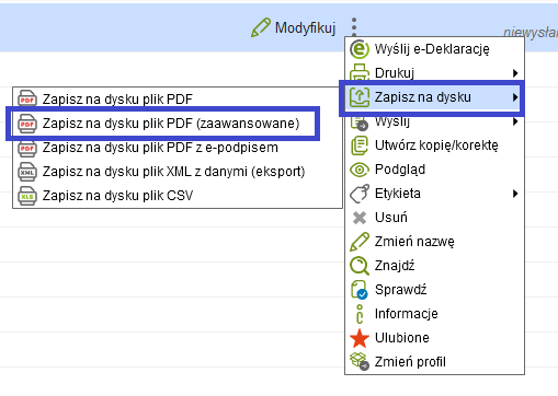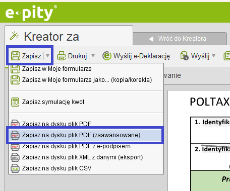lub zakładki Moje formularze poprzez rozwinięcie menu przy przycisku ‘Zapisz na dysku’ i wyborze opcji ‘Zapisz na dysku plik PDF (zaawansowane)’.