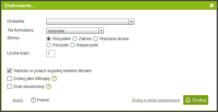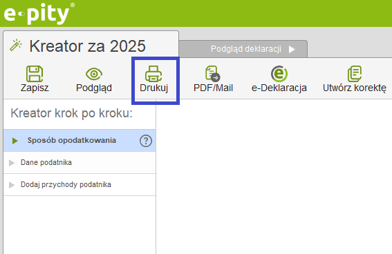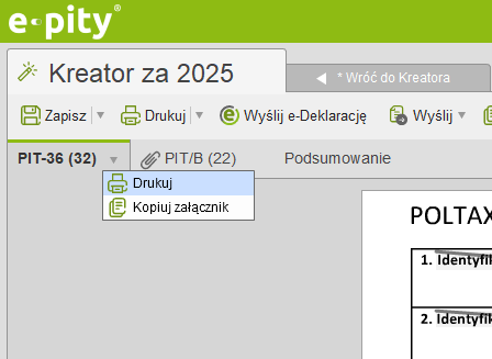 Jeśli potrzebujesz wydrukować tylko jeden formularz załącznika albo samą główną deklarację, kliknij w zakładkę tego formularza i użyj opcji 'Drukuj'.