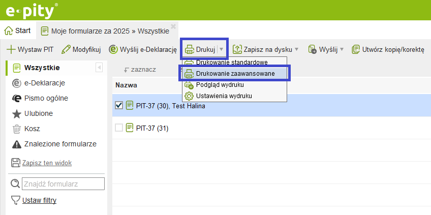 Drukowanie zaawansowane uruchamiamy z poziomu podglądu deklaracji lub z zakładki Moje formularze poprzez rozwinięcie menu przy przycisku Drukuj i wybraniu opcji 'Drukowanie zaawansowane':