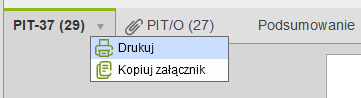 Jeśli wypełniałeś formularz PIT razem z załącznikami i chcesz wydrukować główną deklarację razem ze wszystkim załącznikami użyj przycisku Drukuj z górnego menu na szarym pasku.