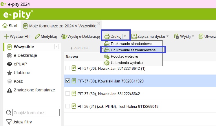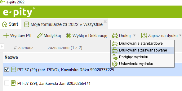 Drukowanie zaawansowane uruchamiamy z poziomu podglądu deklaracji lub z zakładki Moje formularze poprzez rozwinięcie menu przy przycisku Drukuj i wybraniu opcji 'Drukowanie zaawansowane':