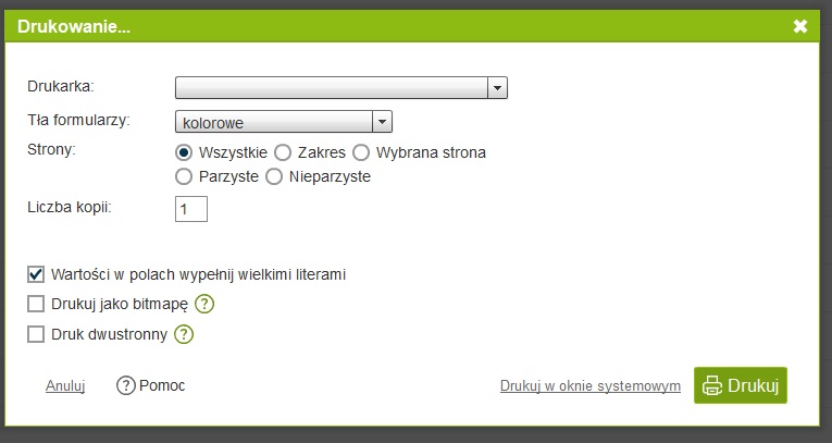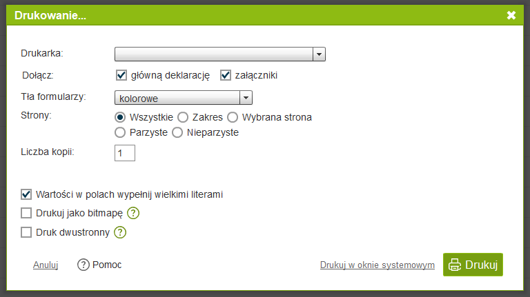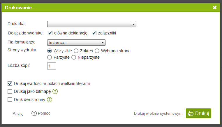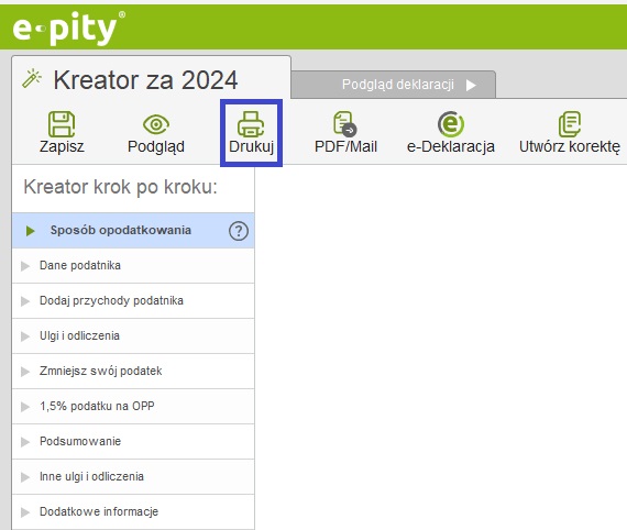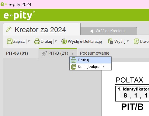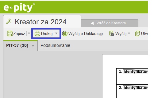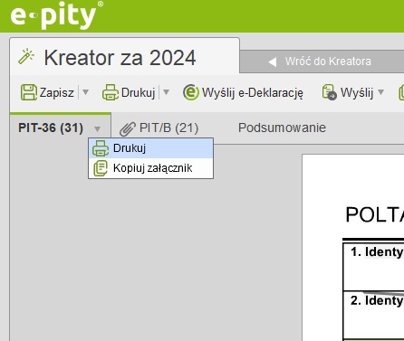 Jeśli potrzebujesz wydrukować tylko jeden formularz załącznika albo samą główną deklarację, kliknij w zakładkę tego formularza i użyj opcji 'Drukuj'.