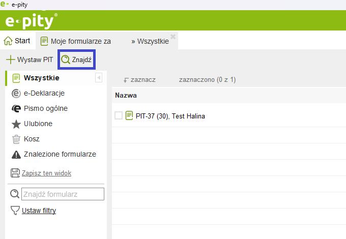 Wszystkie zapisane deklaracje w programie są dostępne w zakładce 'Moje formularze'. Po wejściu do zakładki 'Moje formularze', w menu znajdują się główne kategorie formularzy (Wszystkie, e-Deklaracje, ePUAP, Ulubione, Usunięte), wg których możemy sortować deklaracje z listy.