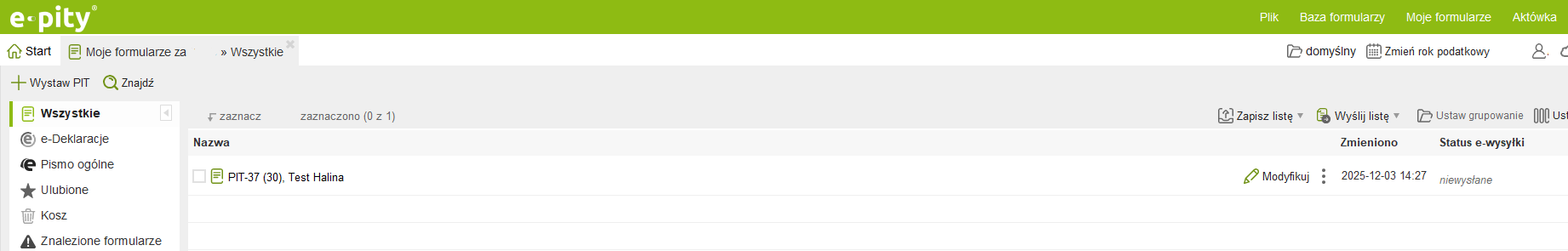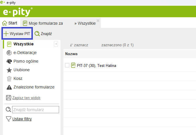 Z poziomu 'Moje formularze' można również wypełnić deklarację PIT – służy do tego opcja 'Wystaw PIT'.