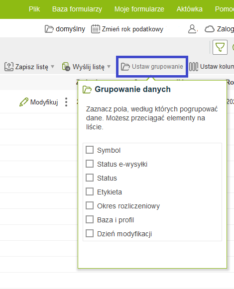 Z poziomu zakładki Moje formularze, możemy pogrupować wypełnione deklaracje np. wybierając według symbolu, statusu e-Deklaracji,