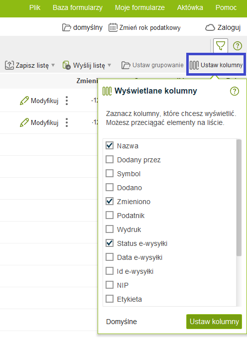 Dostępna jest również opcja 'Ustaw kolumny' (w prawym górnym rogu listy). Po kliknięciu w nią pojawia się dodatkowe okno, w którym zaznaczamy te kolumny, które mają się wyświetlać na liście.
