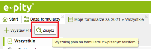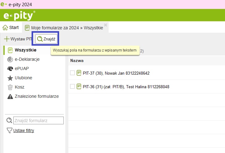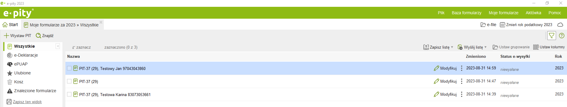Wszystkie zapisane deklaracje w programie są dostępne w zakładce 'Moje formularze'. Po wejściu do zakładki 'Moje formularze', w menu znajdują się główne kategorie formularzy (Wszystkie, e-Deklaracje, ePUAP, Ulubione, Usunięte), wg których możemy sortować deklaracje z listy.