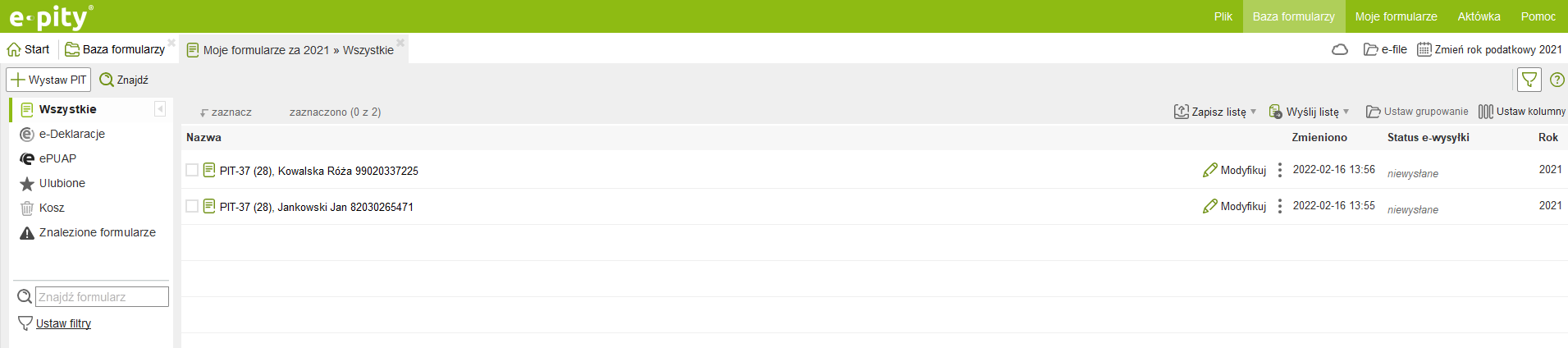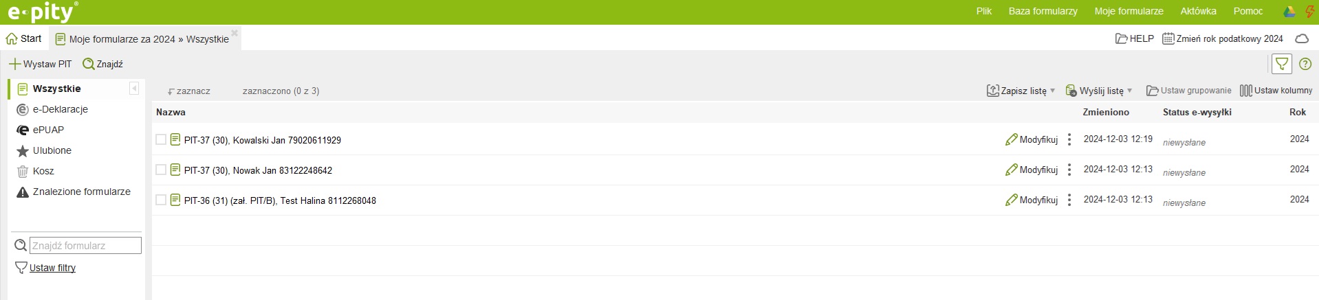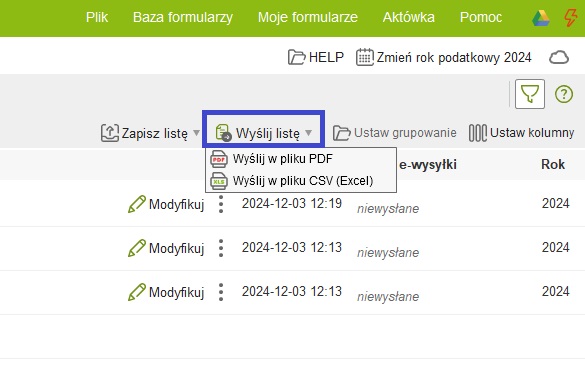 Na liście formularzy mamy możliwość zaznaczyć i wyeksportować wiele deklaracji jednocześnie.