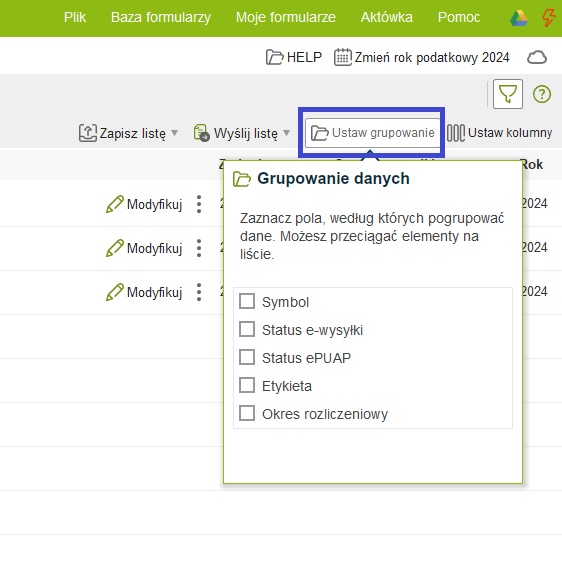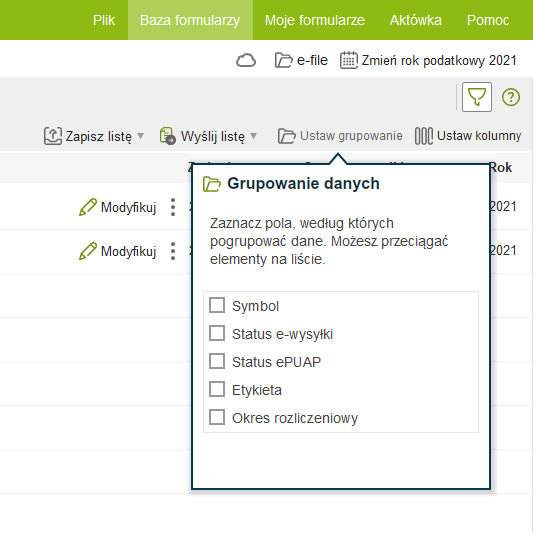 Z poziomu zakładki Moje formularze, możemy pogrupować wypełnione deklaracje np. wybierając według symbolu, statusu e-Deklaracji,
