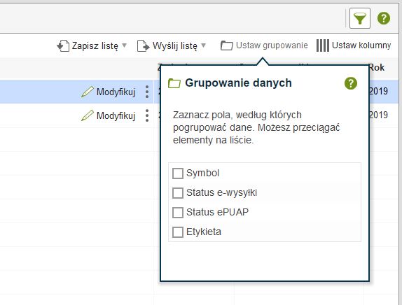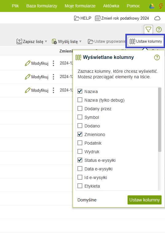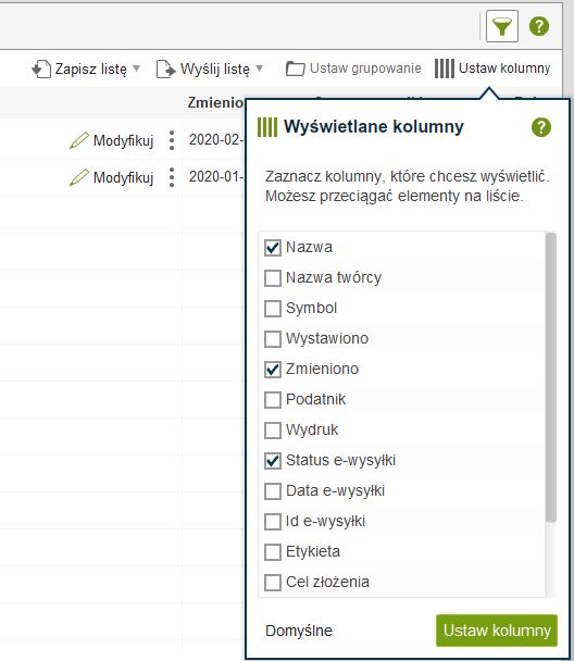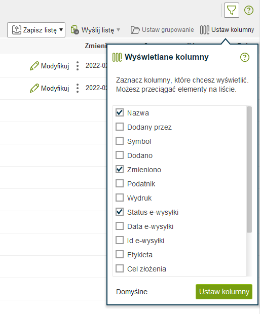 Dostępna jest również opcja 'Ustaw kolumny' (w prawym górnym rogu listy). Po kliknięciu w nią pojawia się dodatkowe okno, w którym zaznaczamy te kolumny, które mają się wyświetlać na liście.