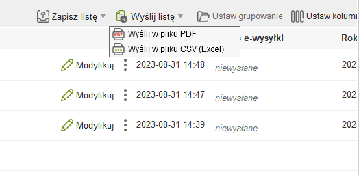 Wyświetloną listę deklaracji PIT możemy zapisać do pliku PDF lub CSV na dysku naszego komputera, wysłać mailem lub wydrukować.