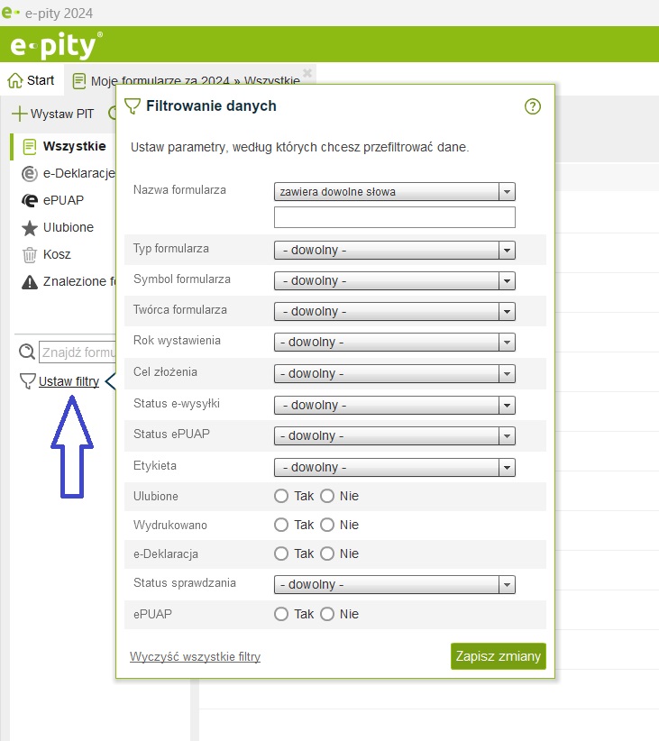 Dodatkowo możemy skorzystać z opcji 'Ustaw filtry':