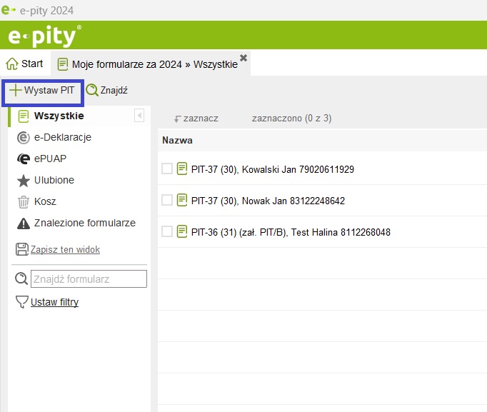 Z poziomu 'Moje formularze' można również wypełnić deklarację PIT – służy do tego opcja 'Wystaw PIT'.