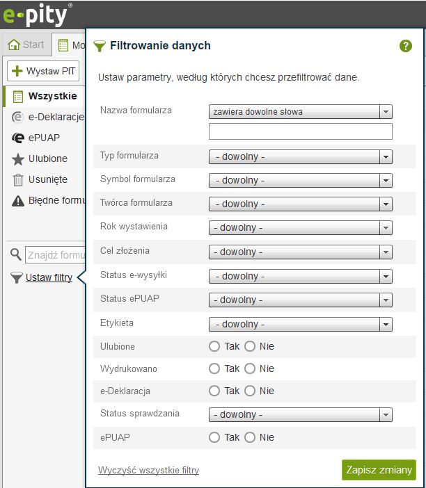 Po ustawieniu filtrów zapisujemy zmiany i wypełnione deklaracje przefiltrują się wg wybranych filtrów. Tak ustawiony widok możemy zapisać klikając w opcję 'Zapisz ten widok'.