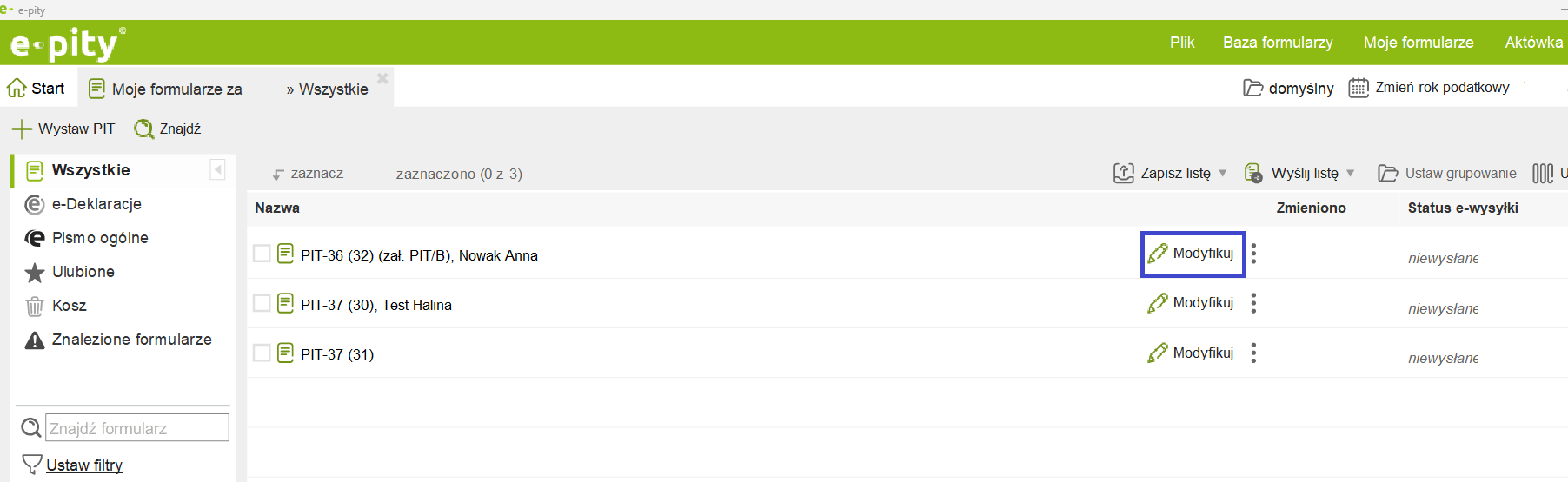 Wypełnioną wcześniej deklarację możesz w każdej chwili zmodyfikować. Wypełnione deklaracje znajdziesz w oknie głównym programu lub klikając w menu w zakładkę 'Moje formularze'.
