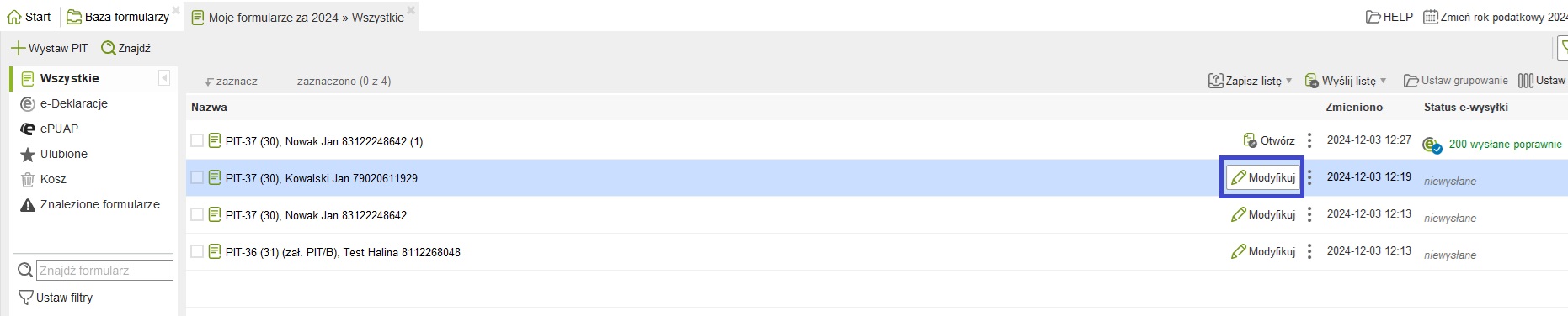 Wypełnioną wcześniej deklarację możesz w każdej chwili zmodyfikować. Wypełnione deklaracje znajdziesz w oknie głównym programu lub klikając w menu w zakładkę 'Moje formularze'.