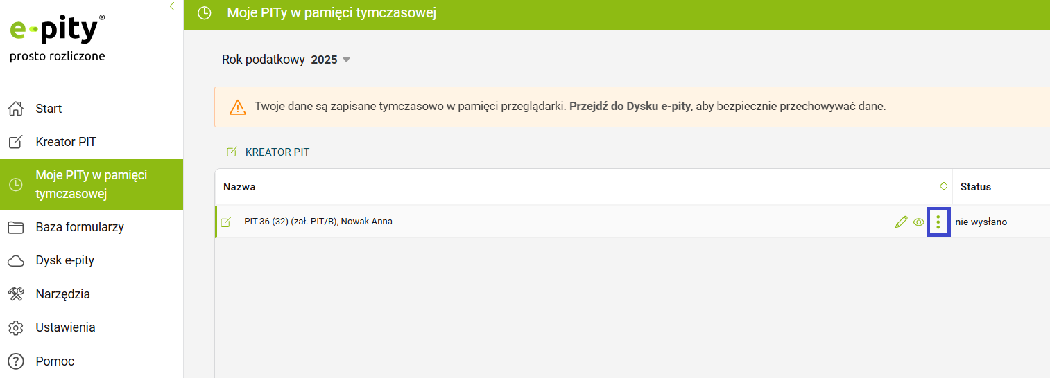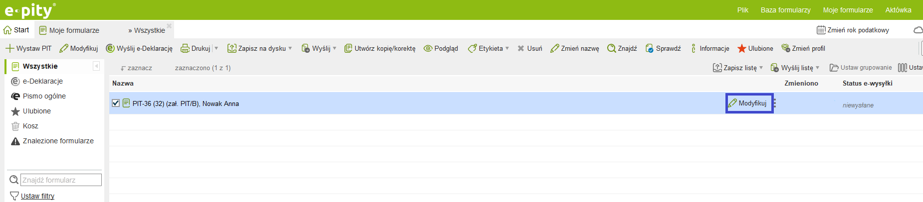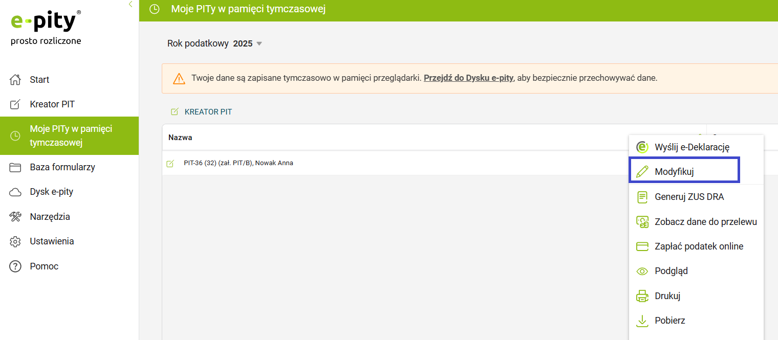 Uruchom Program e-pity desktop, wejdź w zakładkę ‘Moje formularze za rok 2025’ i z tego poziomu otwórz swoją deklarację - przycisk ‘Otwórz’ lub ‘Modyfikuj’ (w przypadku deklaracji, która nie została wysłana do systemu e-Deklaracje).