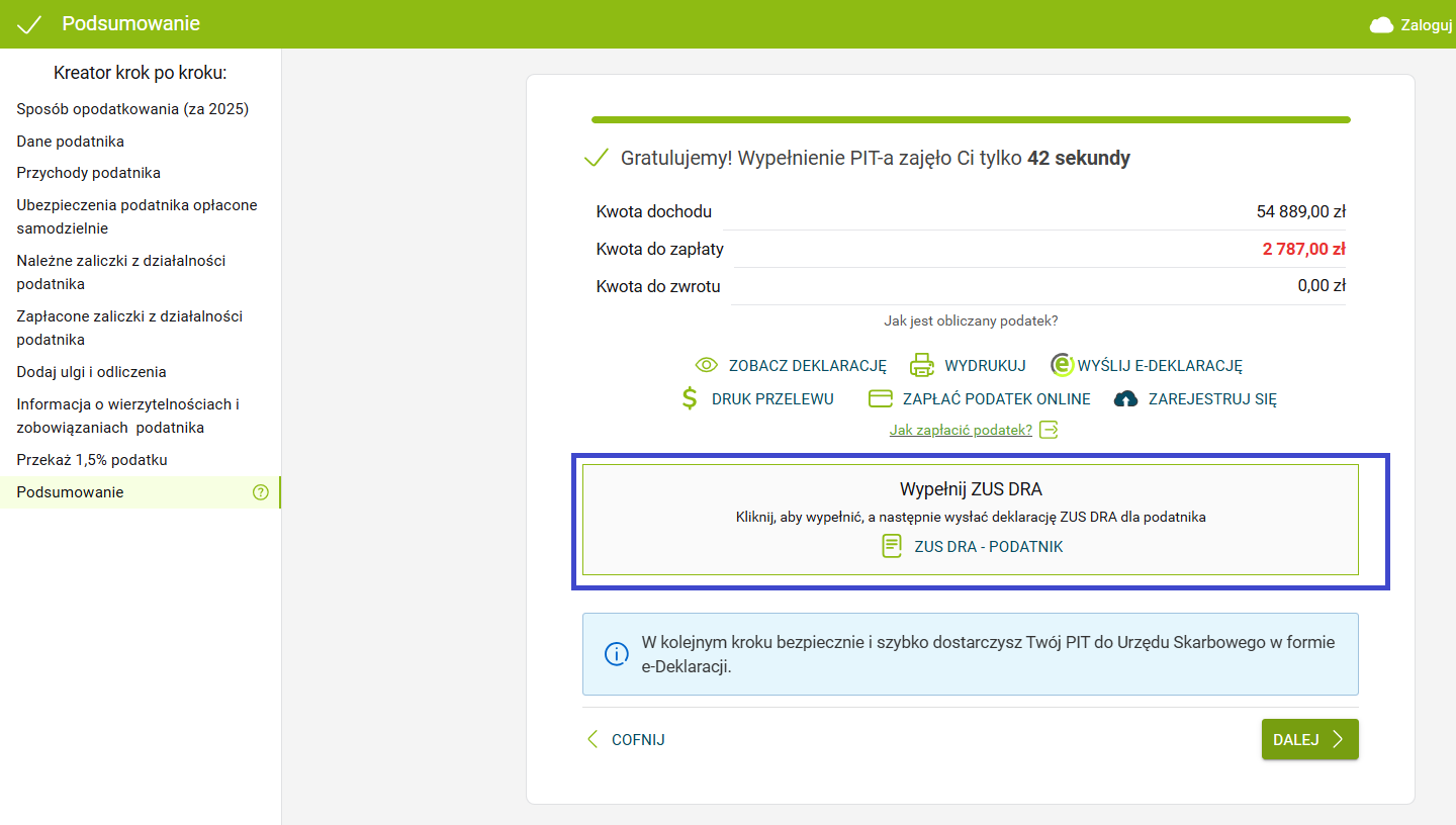 W oknie ‘Podsumowanie’ kliknij w ZUS DRA - Podatnik.