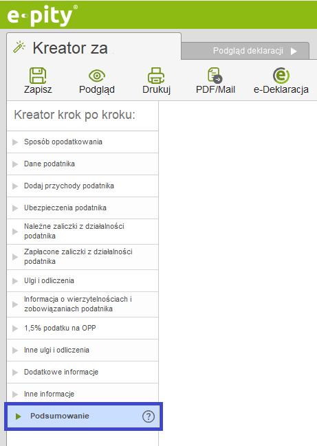 Przejdź do okna ‘Podsumowanie’ - masz możliwość wybrać ‘Podsumowanie’ bezpośrednio z lewego menu ‘Kreator krok po kroku’