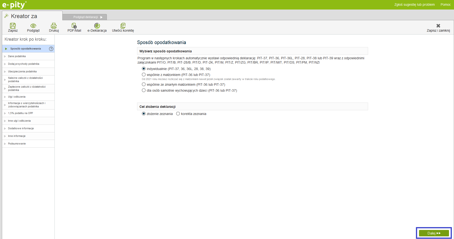 a następnie przejdź do okna ‘Podsumowanie’, klikając 'Dalej' przez kolejne kroki kreatora PIT.