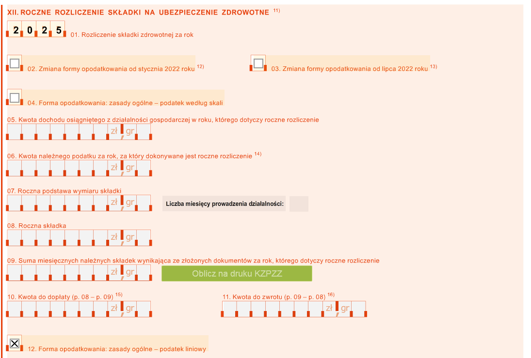 W przypadku wybranej formy opodatkowania zasady ogólne - podatek liniowy, sekcja XII w ZUS DRA wypełni się w następujący sposób.