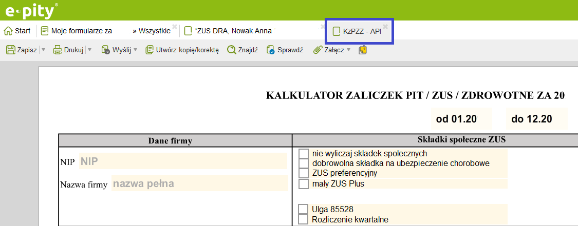 Jeśli wybierzesz opcję ‘Oblicz na druku KzPZZ’, po kliknięciu w przycisk, otworzy się w kolejnej zakładce obok ‘ZUS DRA’ formularz ‘Kalkulator zaliczek PIT/ZUS/Zdrowotne za 2025 - Zestawienie miesięczne’, gdzie będzie można samodzielnie wyliczyć sumę miesięcznych składek, do przeniesienia na roczną deklarację ZUS DRA.