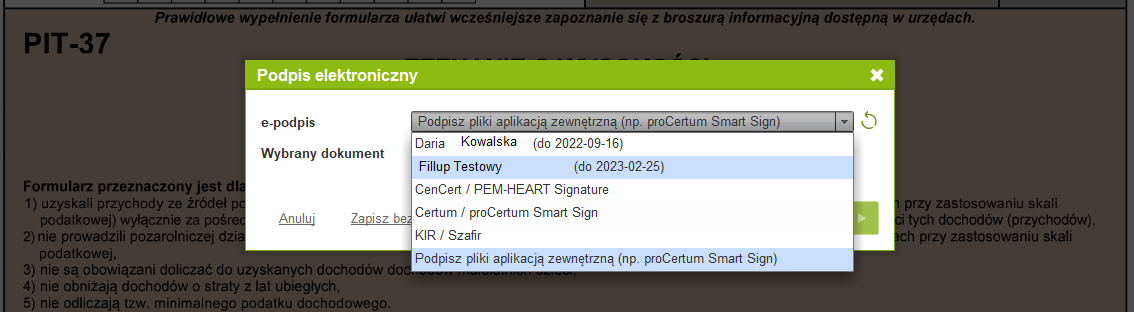 należy wybrać odpowiedni podpis elektroniczny z listy,