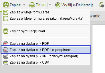 Po wybraniu opcji np. Eksportuj->Zapisz na dysku->Plik PDF z e-podpisem,