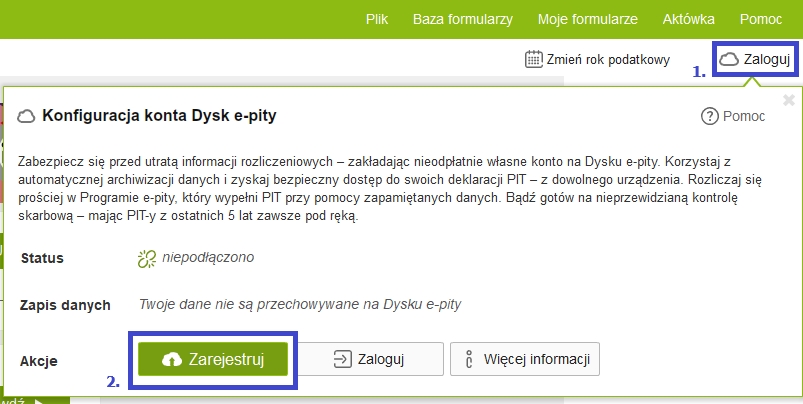 Chcąc zacząć korzystać z Dysku e-pity i zarejestrować konto należy kliknąć ikonę chmurki (1), która znajduje się w prawym górnym rogu programu (jeżeli nie widzisz tej ikony upewnij się, że posiadasz najnowszą wersję programu o numerze 9.3 lub wyższym), a następnie kliknąć w przycisk "Zarejestruj" (2).
