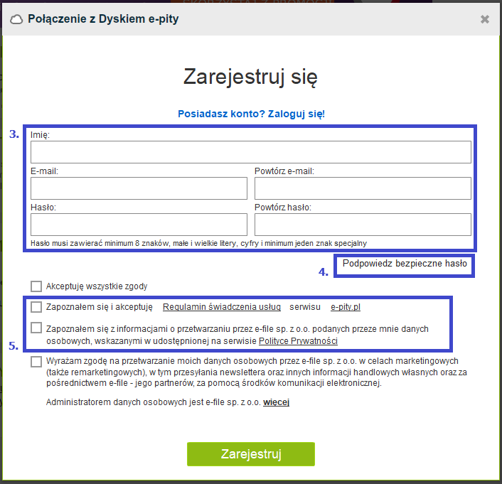 Należy wpisać wymagane dane (3) oraz po zapoznaniu się z regulaminem, zaakceptować wymagane zgody (5). Po kliknięciu przycisku "Podpowiedz bezpieczne hasło" (4) pola "Hasło" oraz "Powtórz hasło" zostaną wypełnione losowym hasłem (spełniającym wymagania bezpieczeństwa) oraz wyświetli się okienko z tym hasłem. Zapamiętaj lub zapisz w bezpiecznym miejscu to hasło, będzie ono wymagane przy logowaniu.