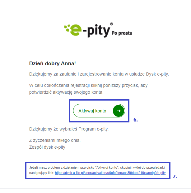 Po kliknięciu przycisku "Zarejestruj" zostanie do Ciebie wysłany mail z linkiem do aktywacji konta. Należy zalogować się na swoją pocztę e-mail, odszukać wiadomość o aktywacji konta na Dysku e-pity i kliknąć przycisk "Aktywuj konto" (6). Jeżeli po kliknięciu przycisku nic się nie stanie można skopiować link (7) widoczny w dole wiadomości i wkleić go do paska adresu w oknie przeglądarki, a następnie zatwierdzić klawiszem enter.