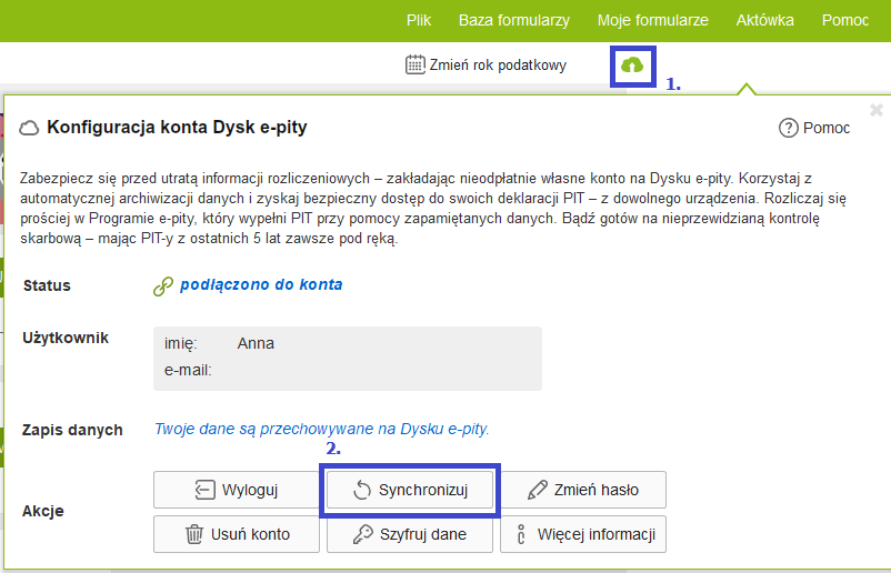 Chcąc wymusić synchronizację danych należy być zalogowanym do Dysku e-pity i kliknąć ikonę chmury (1), a następnie na przycisk "Synchronizuj" (2).