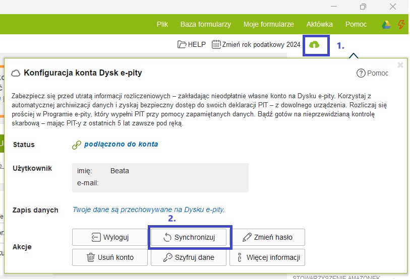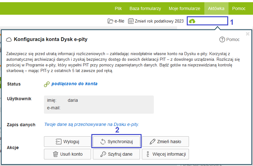 Chcąc wymusić synchronizację danych należy być zalogowanym do Dysku e-pity i kliknąć ikonę chmury (1), a następnie na przycisk "Synchronizuj" (2).