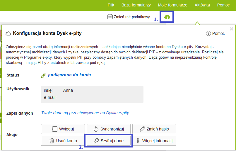 By skutecznie szyfrować swoje dane na Dysku e-pity, wystarczy po zalogowaniu wybrać ikonę chmurki w prawym górnym rogu ekranu (1), a następnie kliknąć przycisk szyfruj dane (2)