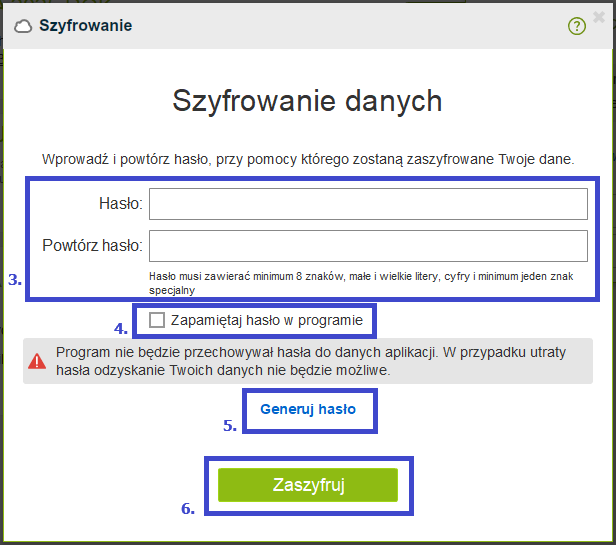 W kolejnym kroku należy podać hasło, którym będą zabezpieczone pliki (3). Można je wygenerować (5) lub podać własne, jeśli spełnia warunki bezpieczeństwa (zawiera osiem znaków, w tym minimum jedną wielką i małą literę, cyfrę oraz znak specjalny, np. #, @, !). Po wprowadzeniu i zatwierdzeniu hasła należy kliknąć przycisk zaszyfruj (6). Można też zapamiętać hasło w programie (4).