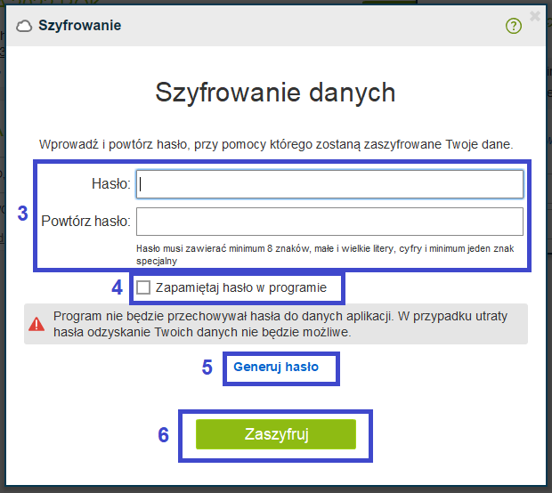 W kolejnym kroku należy podać hasło, którym będą zabezpieczone pliki (3). Można je wygenerować (5) lub podać własne, jeśli spełnia warunki bezpieczeństwa (zawiera osiem znaków, w tym minimum jedną wielką i małą literę, cyfrę oraz znak specjalny, np. #, @, !). Po wprowadzeniu i zatwierdzeniu hasła należy kliknąć przycisk zaszyfruj (6). Można też zapamiętać hasło w programie (4).