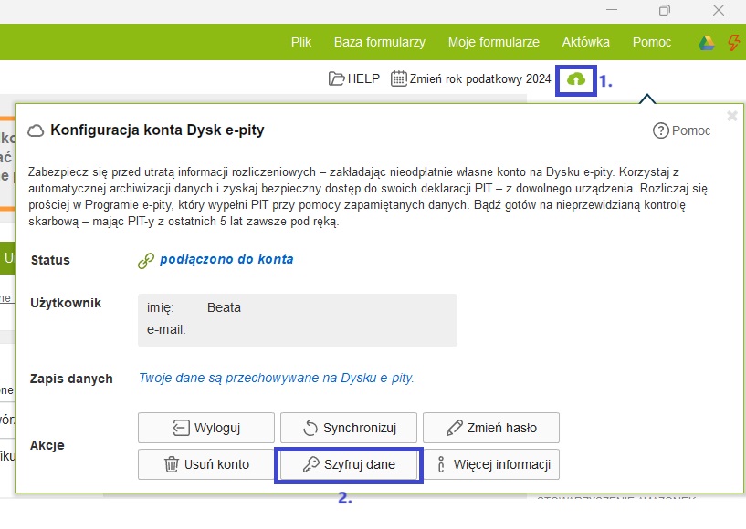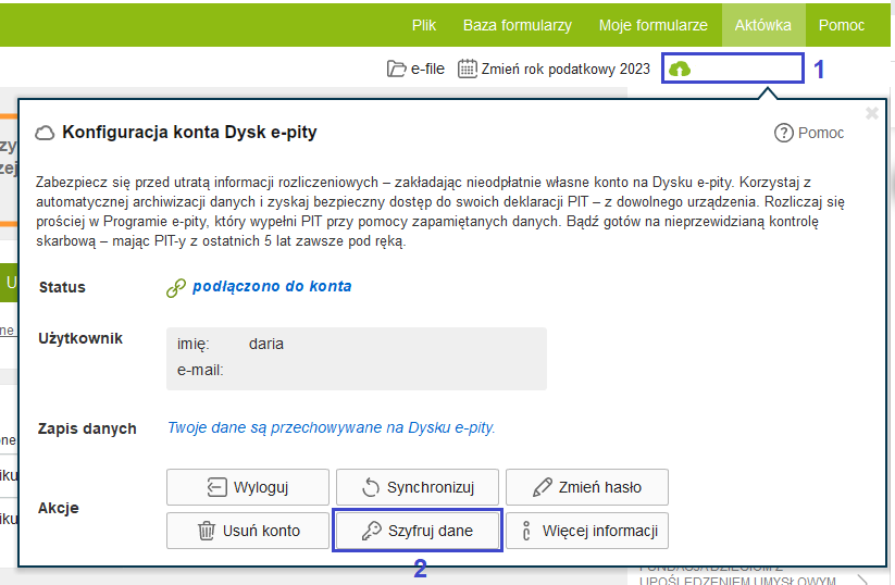 By skutecznie szyfrować swoje dane na Dysku e-pity, wystarczy po zalogowaniu wybrać ikonę chmurki w prawym górnym rogu ekranu (1), a następnie kliknąć przycisk szyfruj dane (2)