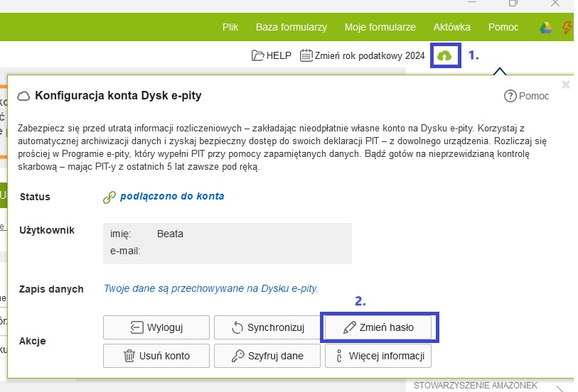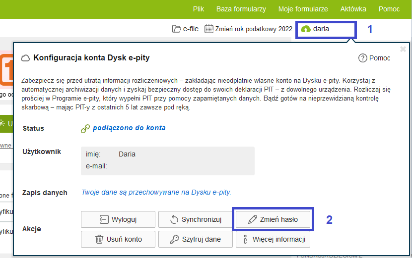 Chcąc zmienić hasło logowania do Dysku e-pity, po zalogowaniu do Dysku należy kliknąć chmurkę w górnym prawym rogu (1) i wybrać przycisk ‘Zmień hasło’ (2)