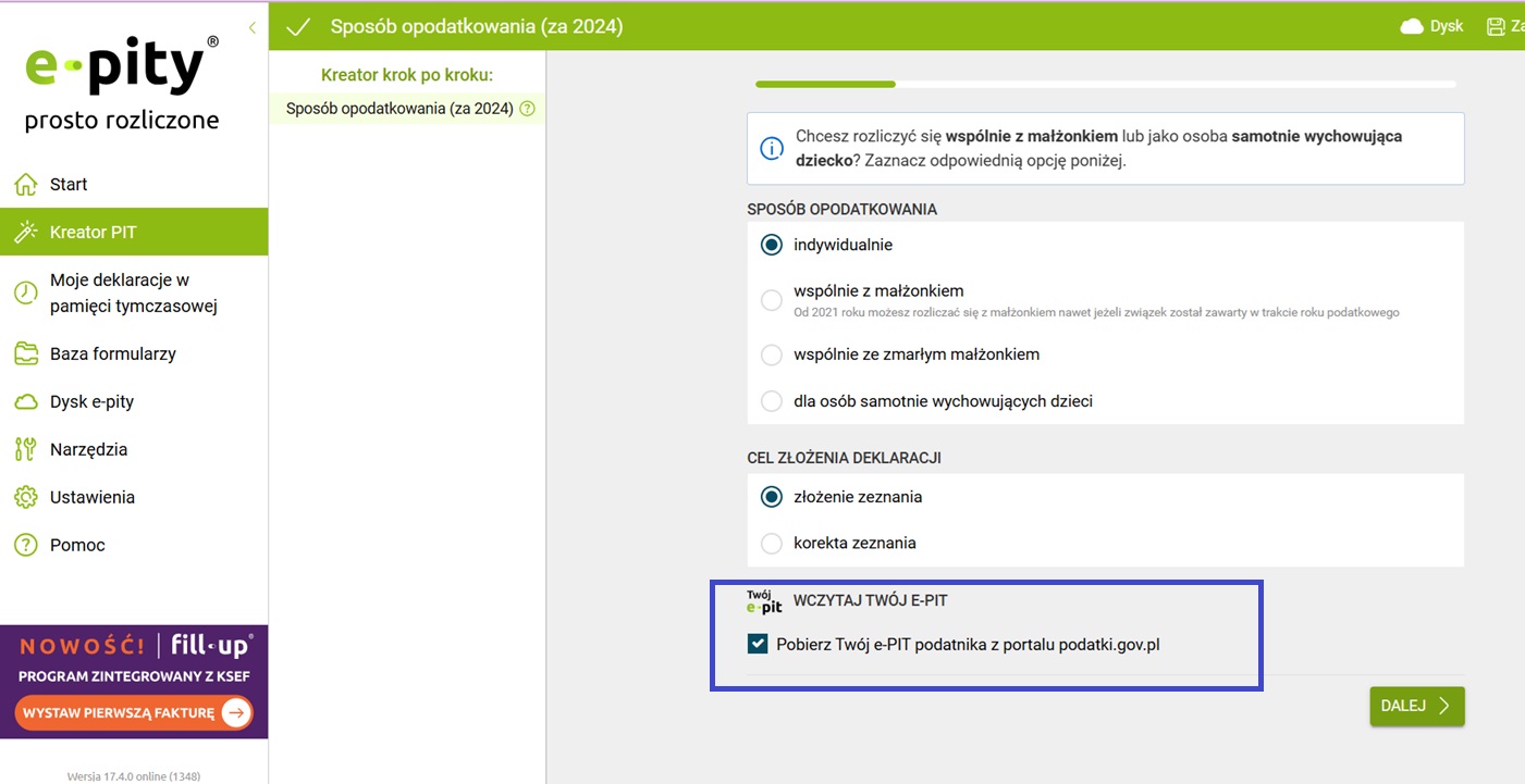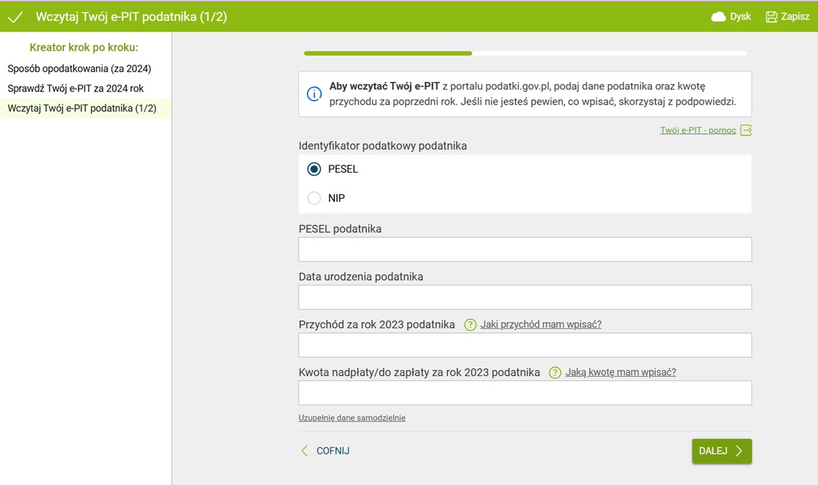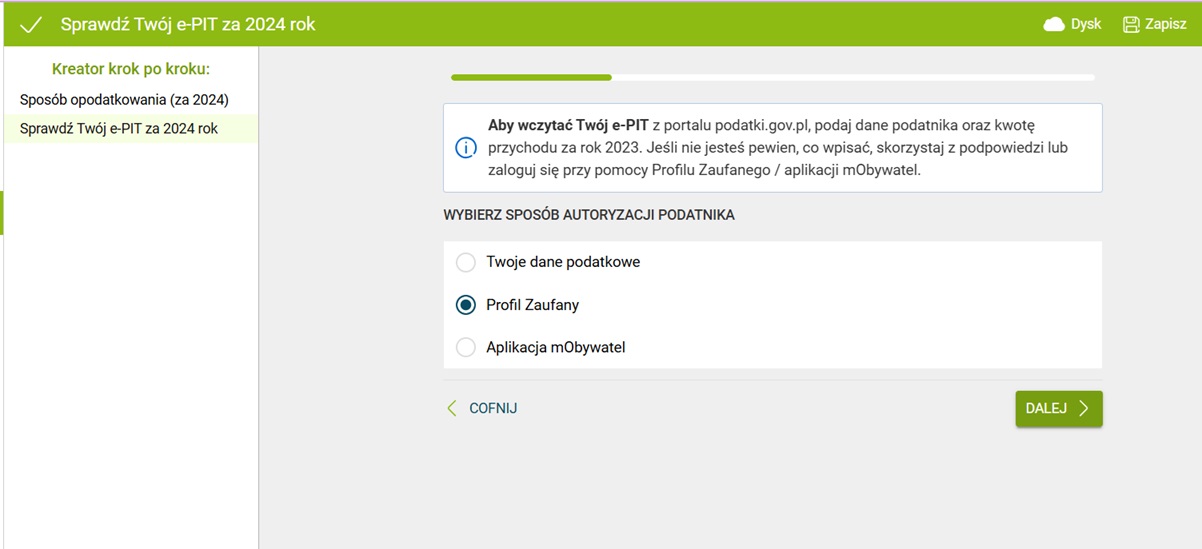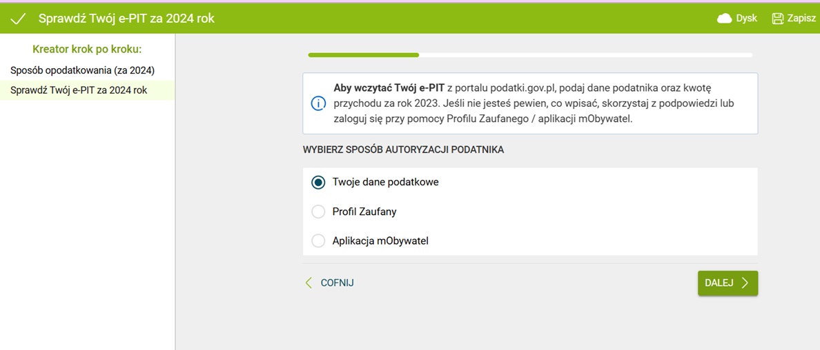 Jeśli wybierzesz 'Kreaotr PIT za 2024 rok', w pierwszym oknie zaznacz 'Pobierz Twój e-PIT z portalu podatki.gov.pl' i przejdź 'Dalej'.