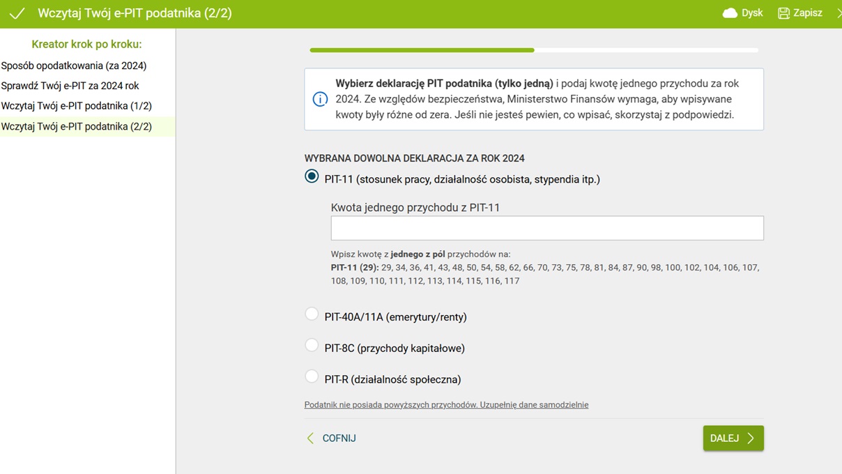W kolejnym oknie wybierz jedną deklarację i podaj kwotę przychodu za rok 2024, następnie kliknij 'Dalej'.