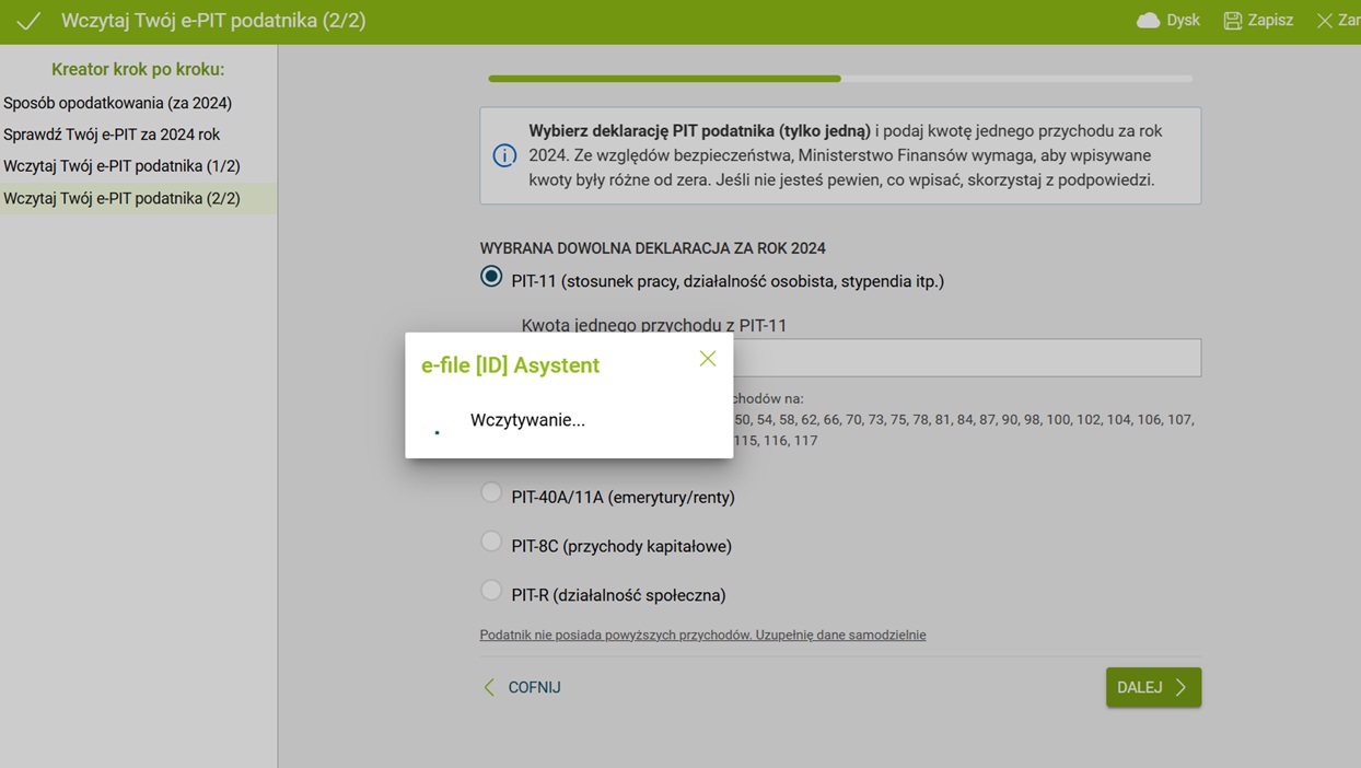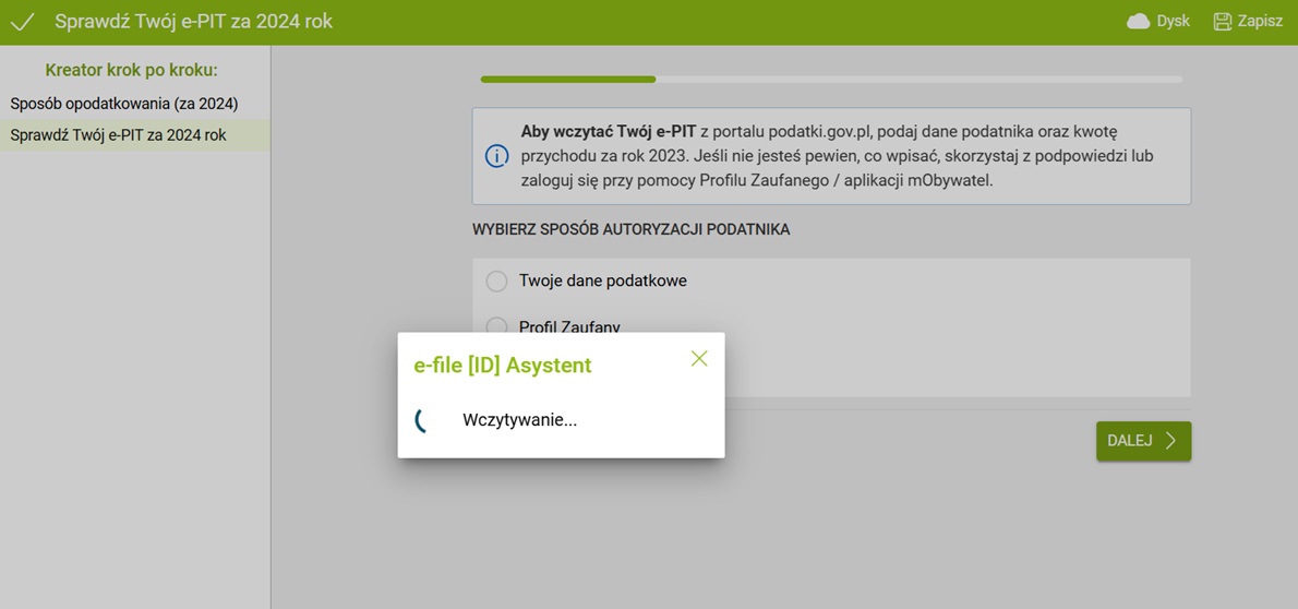 Pojawi się informacja z e-file [ID] Asystent o wczytywaniu danych.