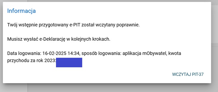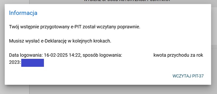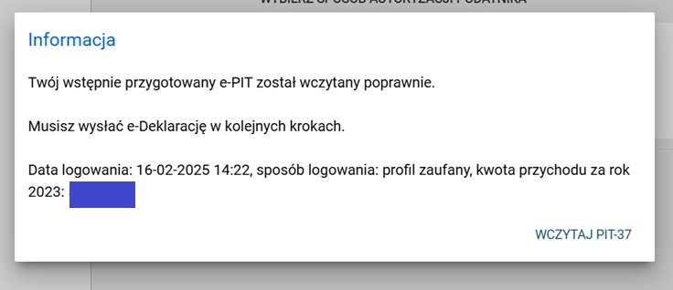Twój wstępnie przygotowany e-PIT został wczytany poprawnie, kliknij 'Wczytaj PIT-37'.