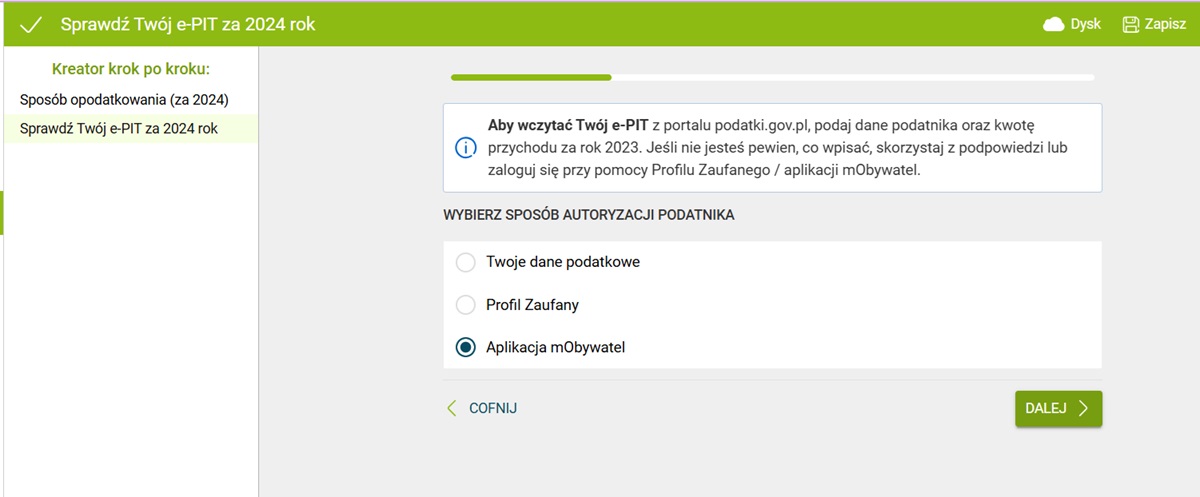 Jeśli chcesz wczytać Twój e-PIT za 2024 rok za pośrednictwem aplikacji mObywatel, zaznacz opcję Aplikacja mObywatel i kliknij na dole w przycisk 'Dalej'.