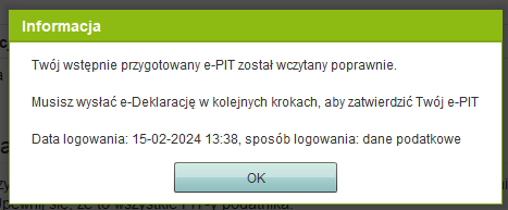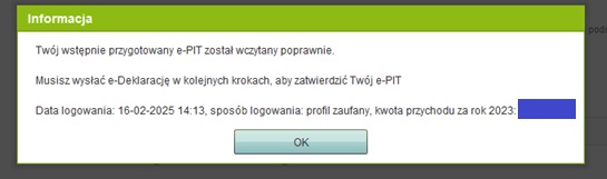 Po zalogowaniu, otrzymasz komunikat, że Twój wstępnie przygotowany e-PIT został poprawnie wczytany do programu.
