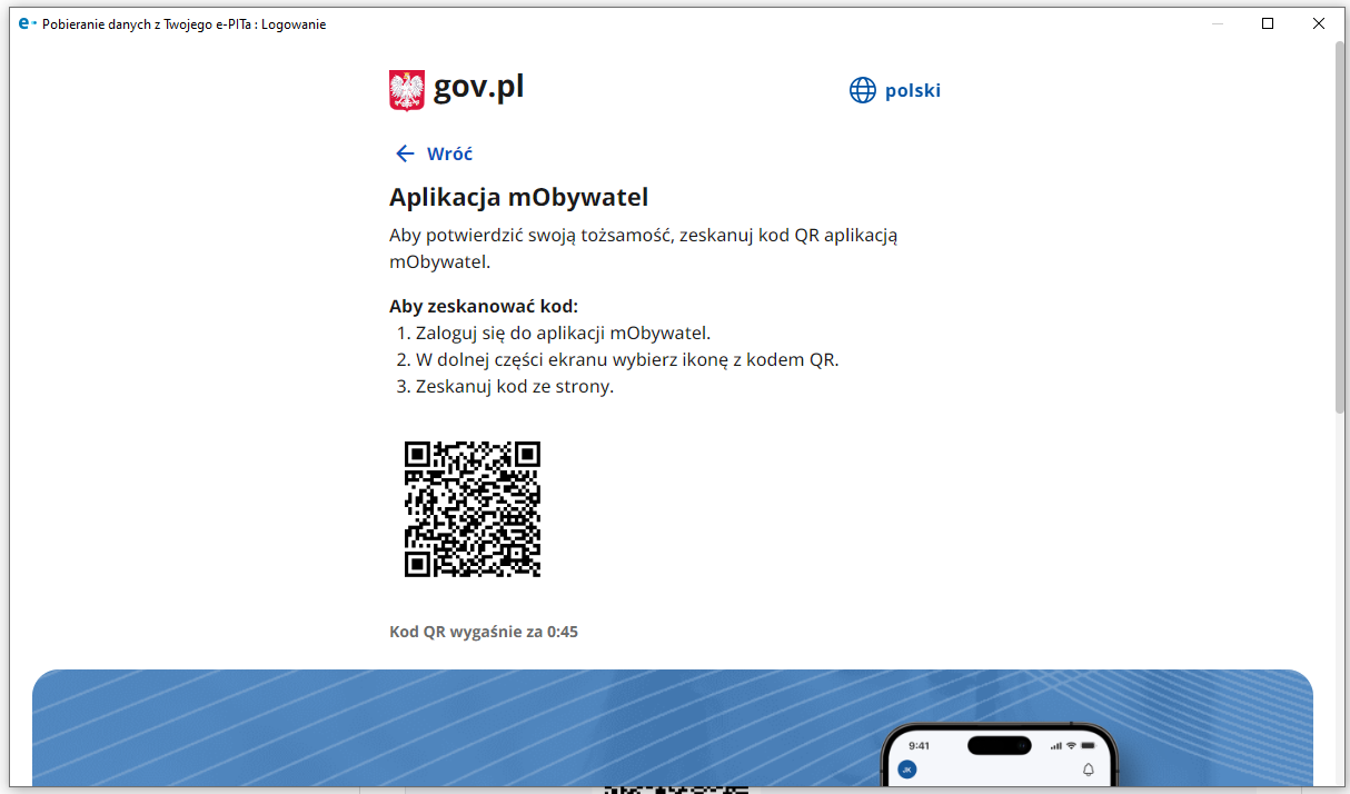 Wyświetli się okno z kodem QR, który należy zeskanować w aplikacji mObywatel postępując zgodnie z instrukcją wyświetloną na stronie.