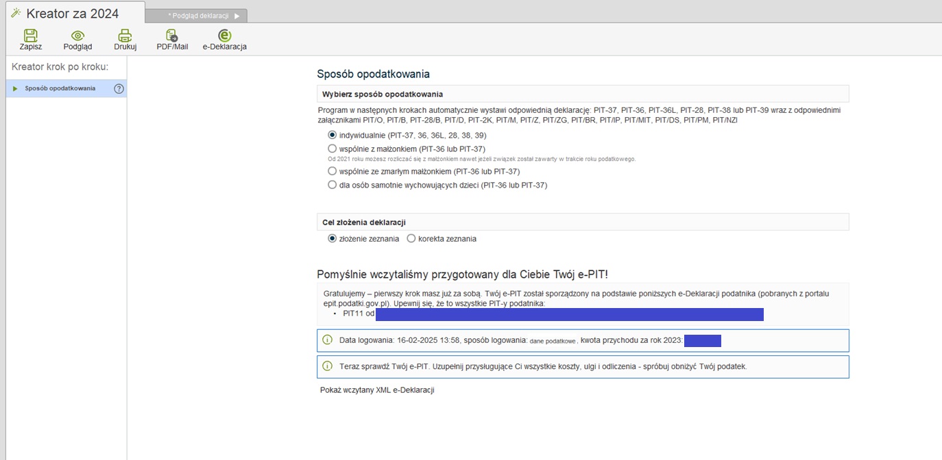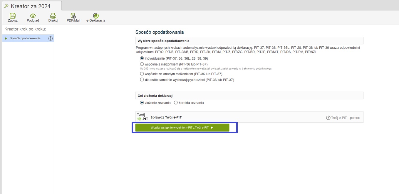 lub kliknij w 'Kreator PIT za 2024' i w oknie 'Sposób opodatkowania' zaznacz opcję 'Wczytaj wstępnie wypełniony PIT z Twój e-PIT'.