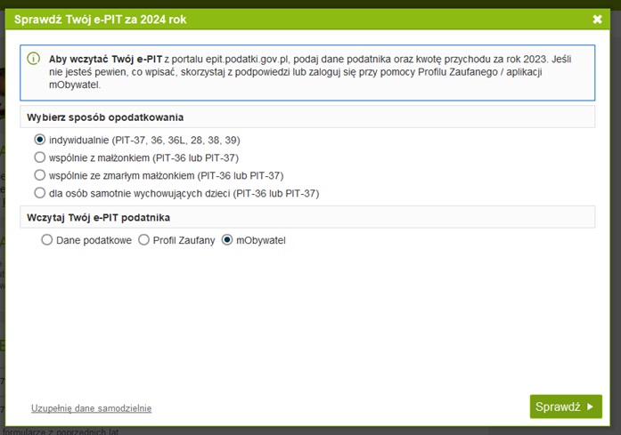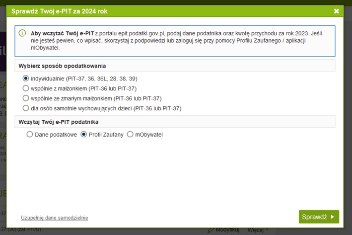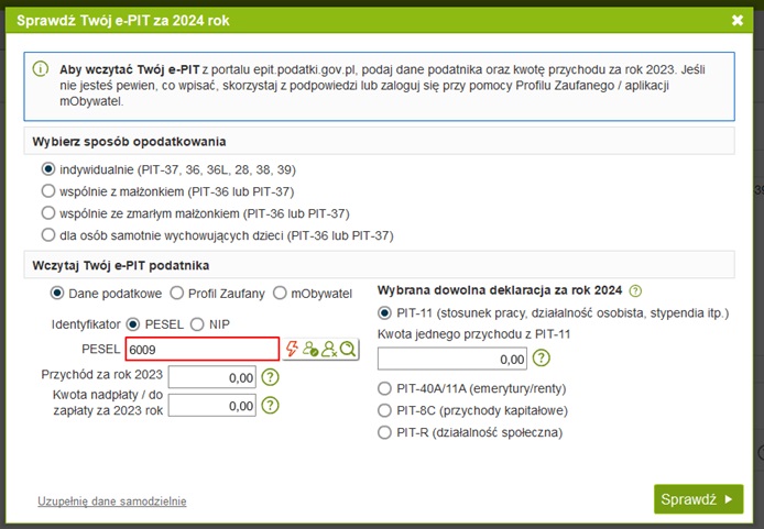 Po kliknięciu 'Sprawdź' lub 'Wczytaj wstępnie wypełniony PIT z Twój e-PIT', otworzy się okno, w którym należy uzupełnić Identyfikator podatkowy (PESEL/NIP), przychód za rok 2023, kwotę nadpłaty/do zapłaty za rok 2023. Z prawej strony należy wybrać jedną deklarację PIT podatnika za rok 2024 i wpisać odpowiednią kwotę, a następnie kliknąć 'Sprawdź'.