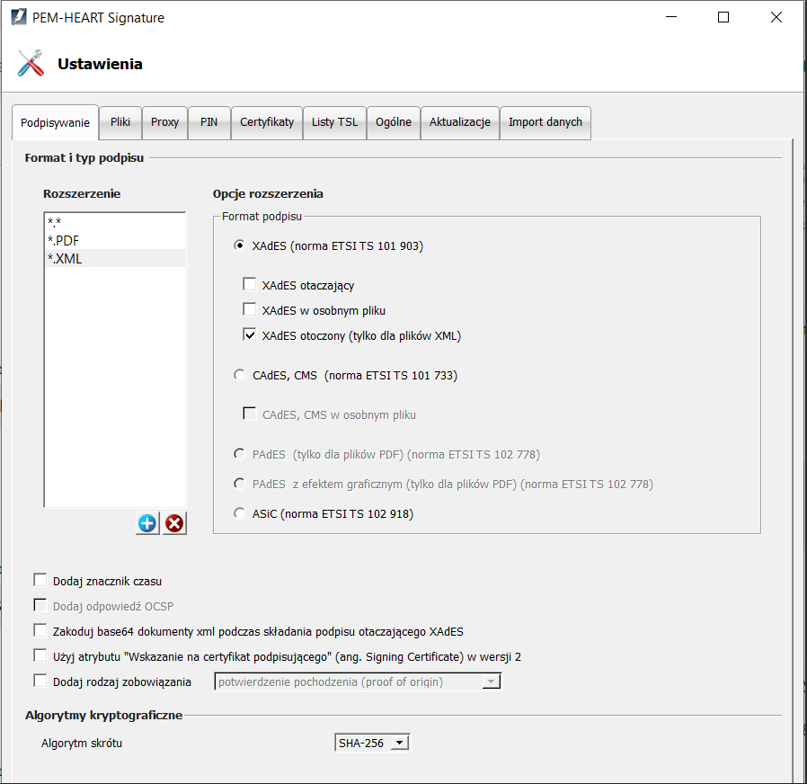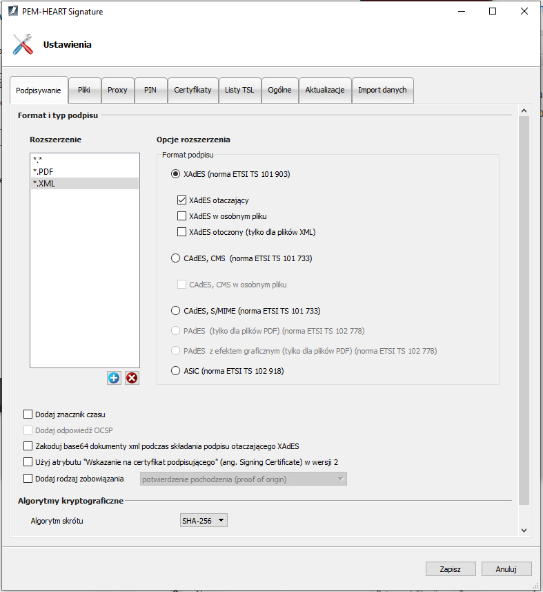 Sprawdzamy konfigurację swojego programu PEM-HEART Signature do e-podpisu, czy jest ustawiona zgodnie w wymogami serwera Ministerstwa.
